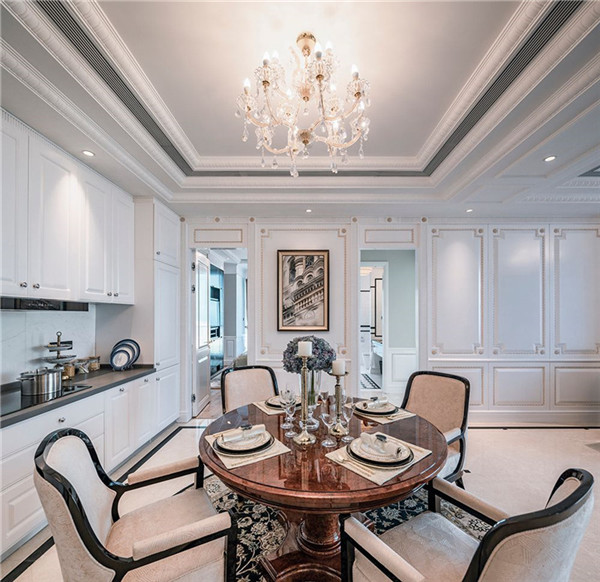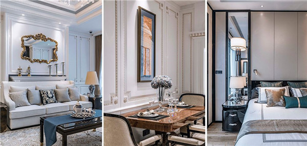 本項目公寓部分室內硬裝、軟裝設計均由港源設計團隊完成。設計師從豪華汽車、游艇、私人飛機的高品質裝潢中獲取設計靈感;設計風格采用改良的古典歐式風格,從簡單到繁雜、從整體到局部,精雕細琢,鑲花刻金都給人一絲不茍的印象,將豪華、優雅的涵義以新時代的面貌予以呈現,并保留了材質、色彩的基本風格,可以強烈地感受傳統的歷史痕跡與渾厚的文化底蘊,同時又摒棄了過于復雜的肌理和裝飾。