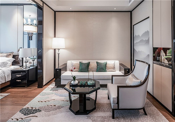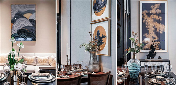 背景墻,以"松竹梅"的枝條、莖干和花瓣為原型,采用激光切割銅色漆面不銹鋼制成,趣意倍添。點綴公寓房間的高雅藝術擺設從中國水墨畫松樹的松枝、毛竹的竹葉及臘梅的花瓣取材,背景墻上有手繪及局部刺繡落排列裝飾,倍添新奇趣意;陳設裝潢亦不乏松樹的主題元素,別具中華情調。