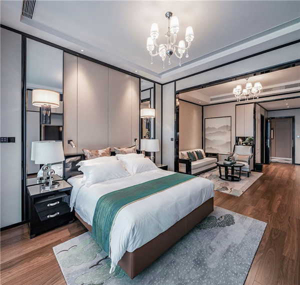 比照五星級酒店的標準,公寓里的床采用了70厘米的床高設計,床墊軟度適中,床頭軟裝采用真皮包裹,集品質感和舒適度為一體。