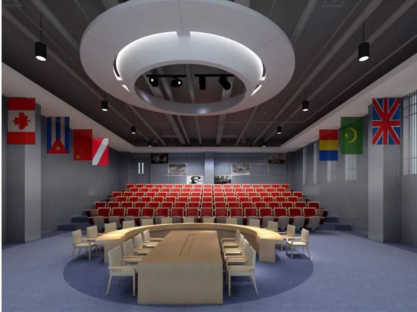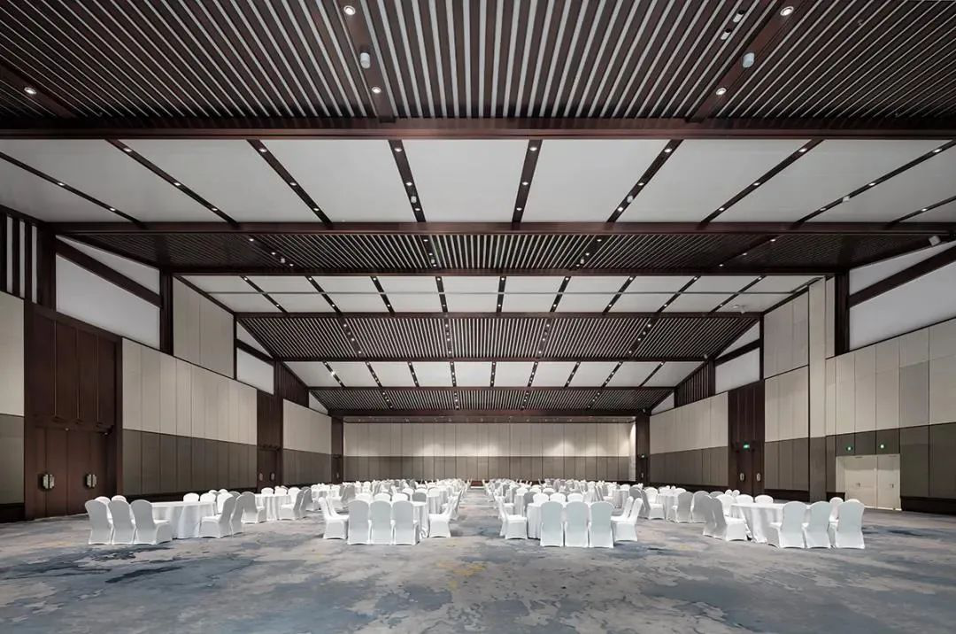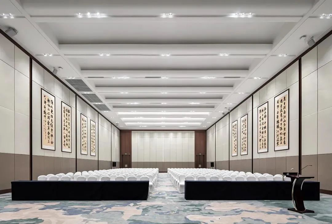 地面整體花團錦簇的手工羊毛毯與天花“芙蓉王國盡朝暉”的主題遙相呼應,材質上,天花立面都采用了金屬鋁板、銅板,總體空間造型更符合建筑聲學反射的構造需求,隱含主次同時便于分割使用,色彩典雅溫和,層次井然有序,尺度震撼,現(xiàn)代而又不失莊重。
