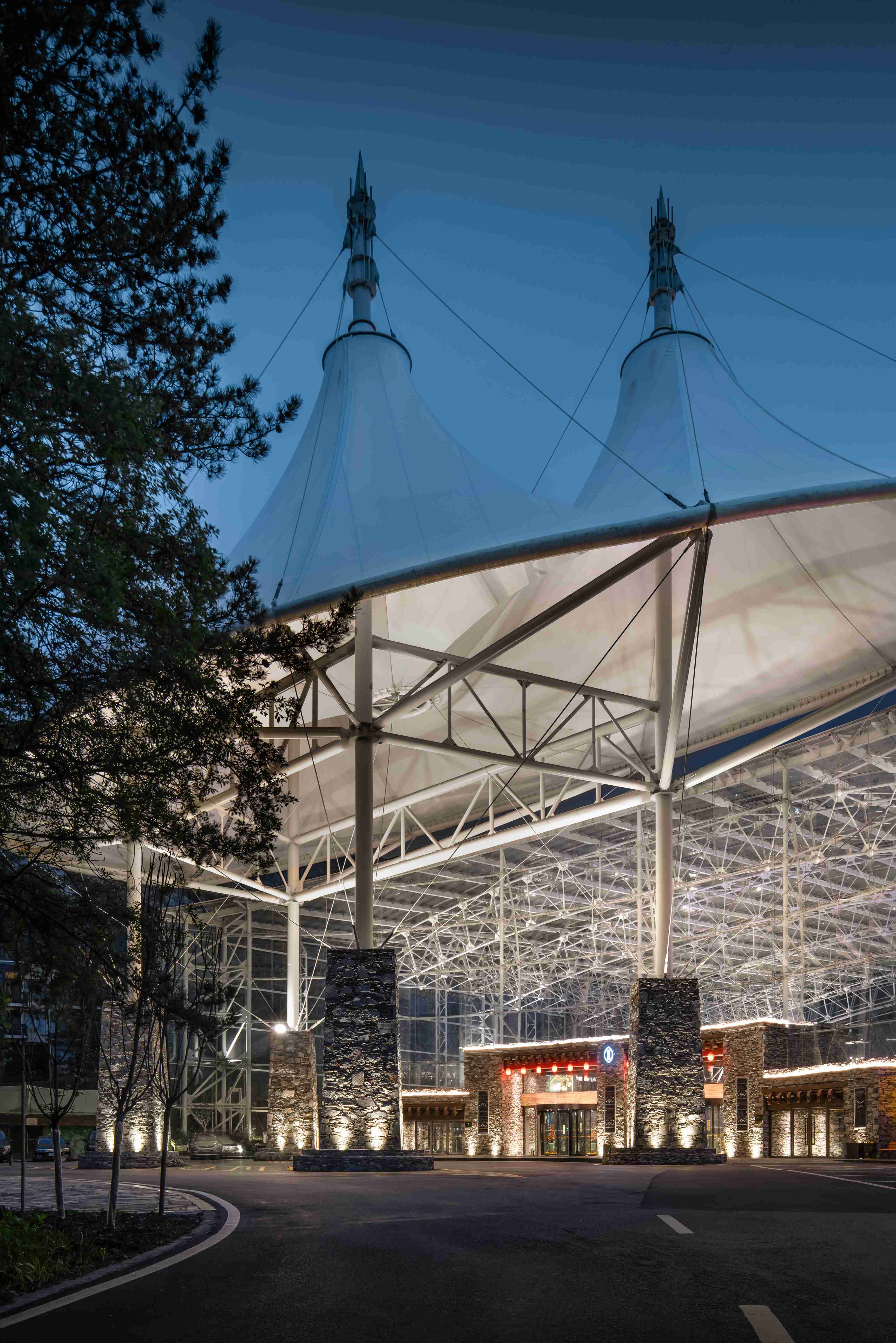 酒店于2003年開業,在當時是亞洲最大的洲際酒店,在2007年初,九寨天堂洲際大飯店又斥資四千五百萬,對其內部進行重新裝修,并在酒店大堂增設了環保地熱供暖系統。整套系統環保效益顯著、無燃燒、無排煙及廢棄物、清潔無污染,為游客提供了更為清新的空氣質量。酒店建筑面積15萬平方米,集會議、餐飲、娛樂、度假、休閑、養生、購物、住宿為一體。整個建筑背靠群山,掩映在原始森林中,集中詮釋了“消失的建筑”這一理念。