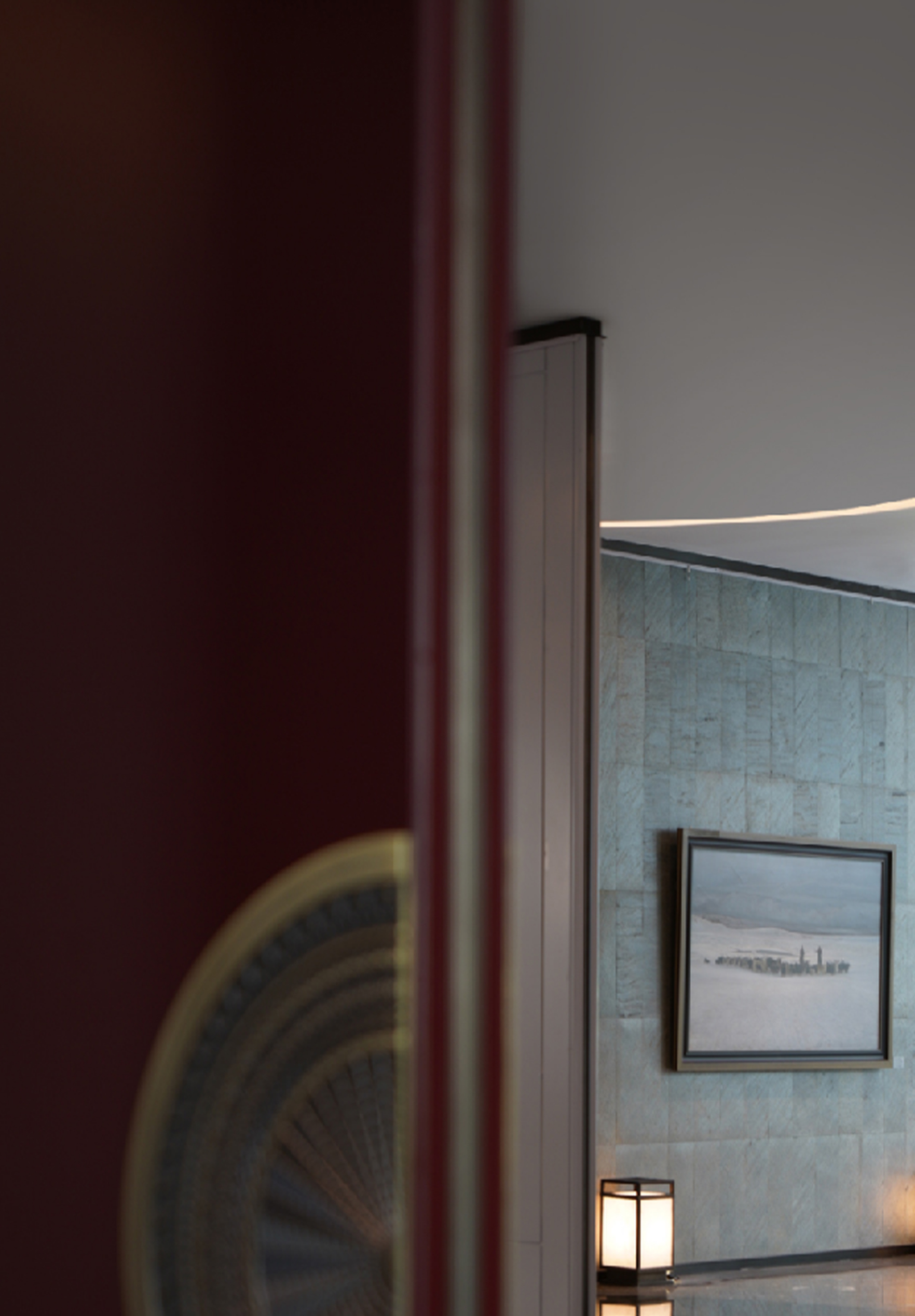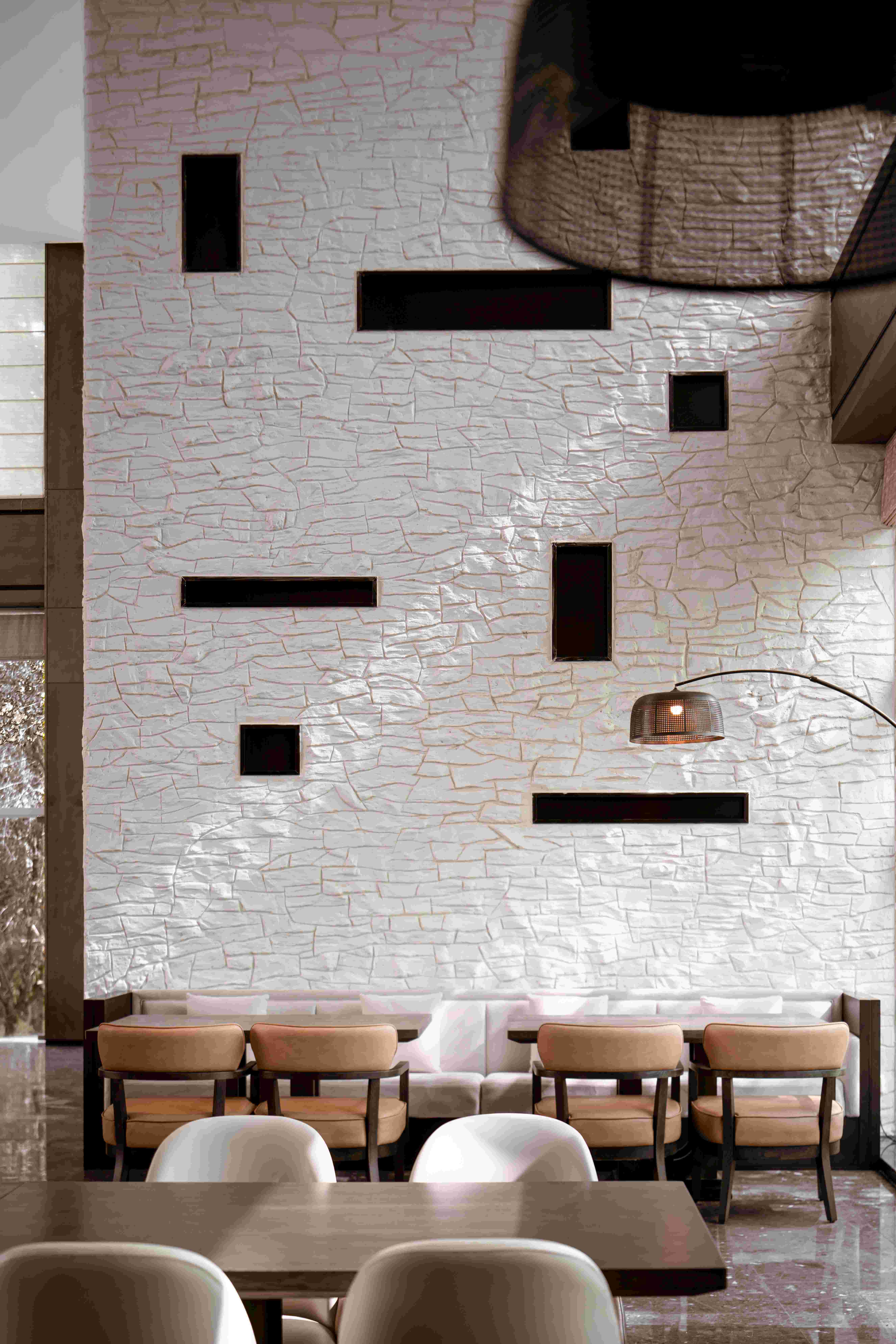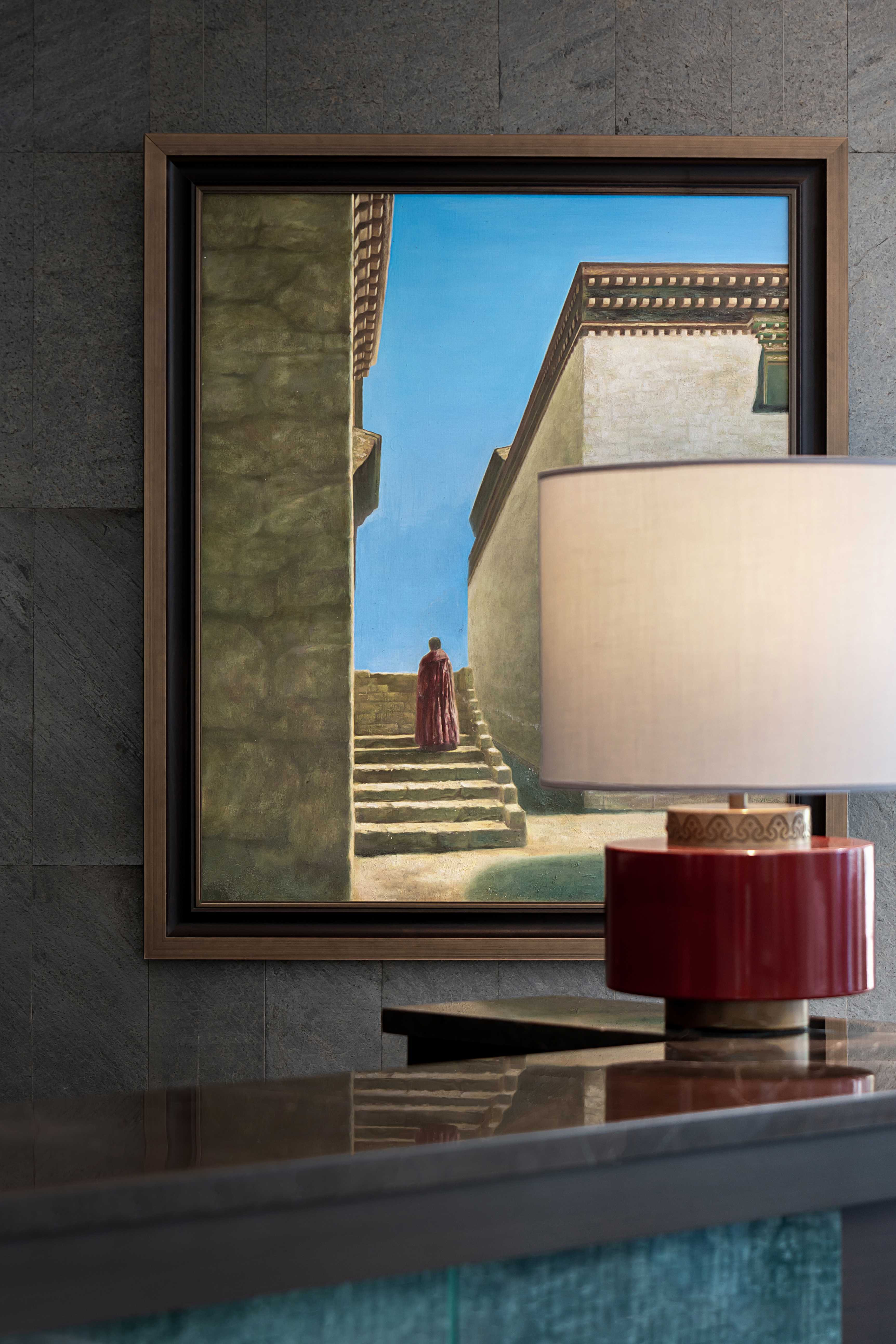 天然質感薄石材墻、藏式邊瑪墻融合藝術畫廊。