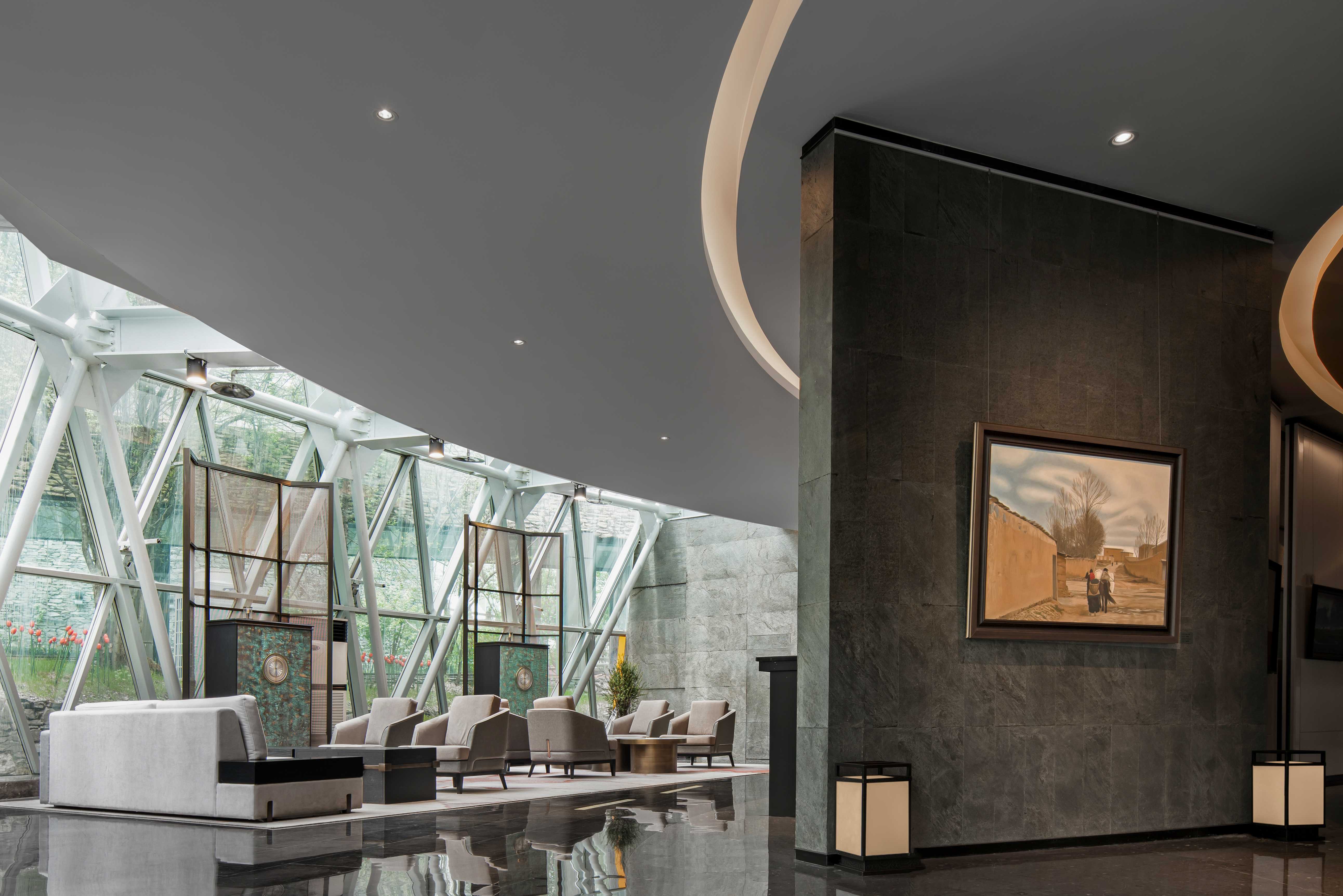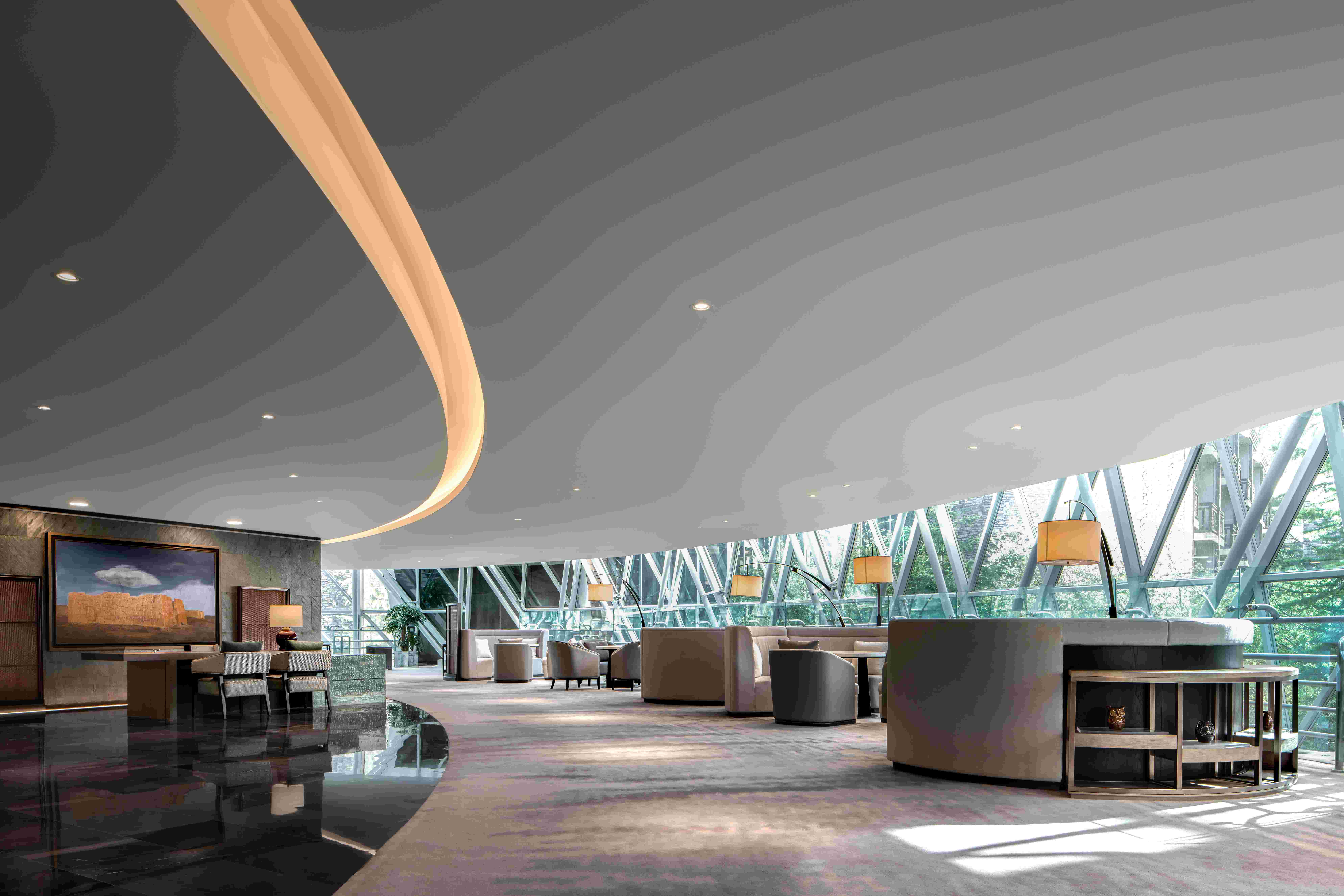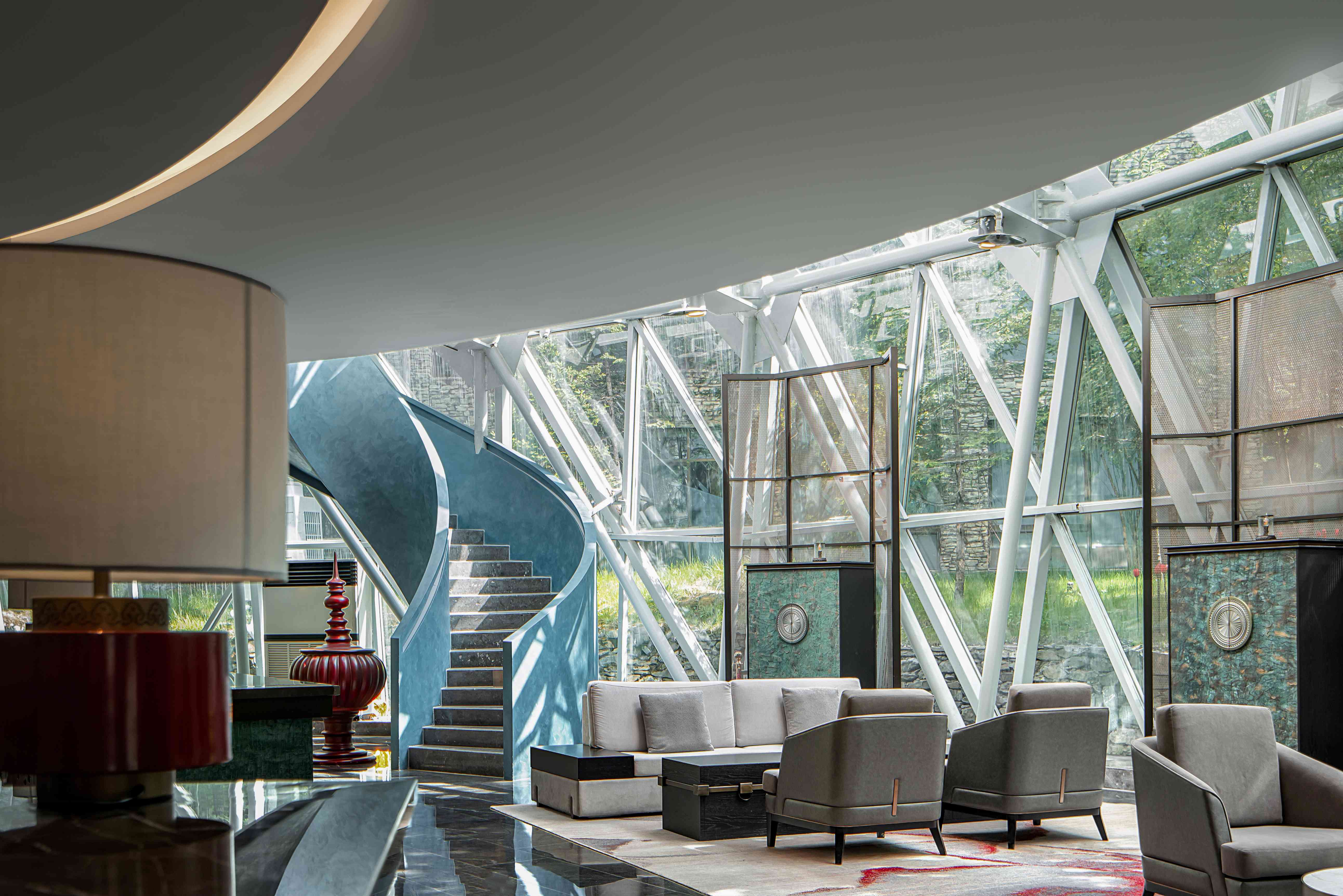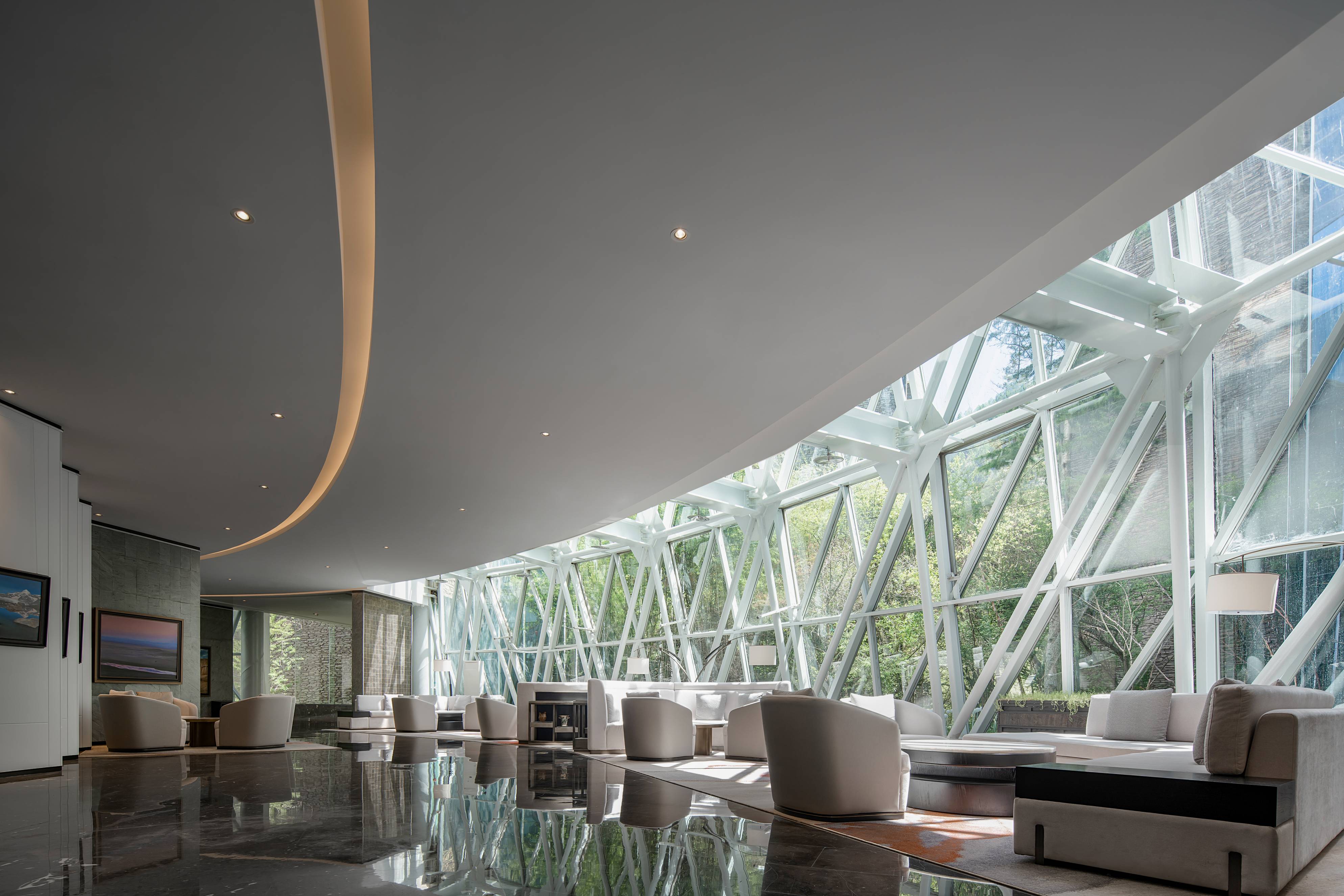 大堂休息區布置在景色最好的區域,這里被自然森林所環抱,不同的時節可感受不同的風景。