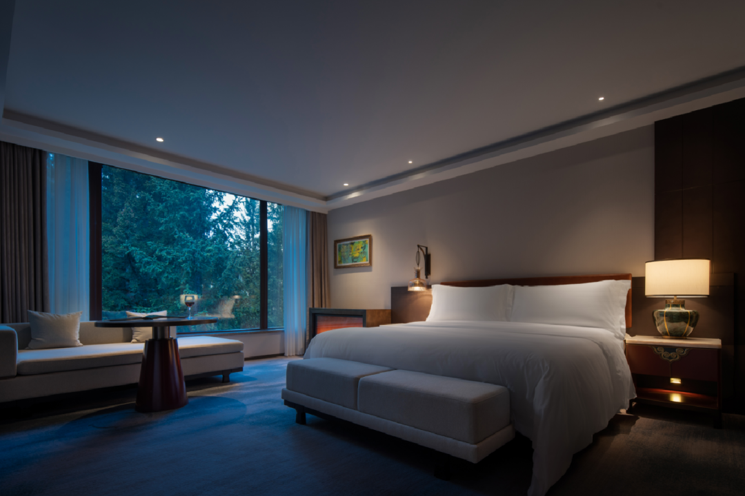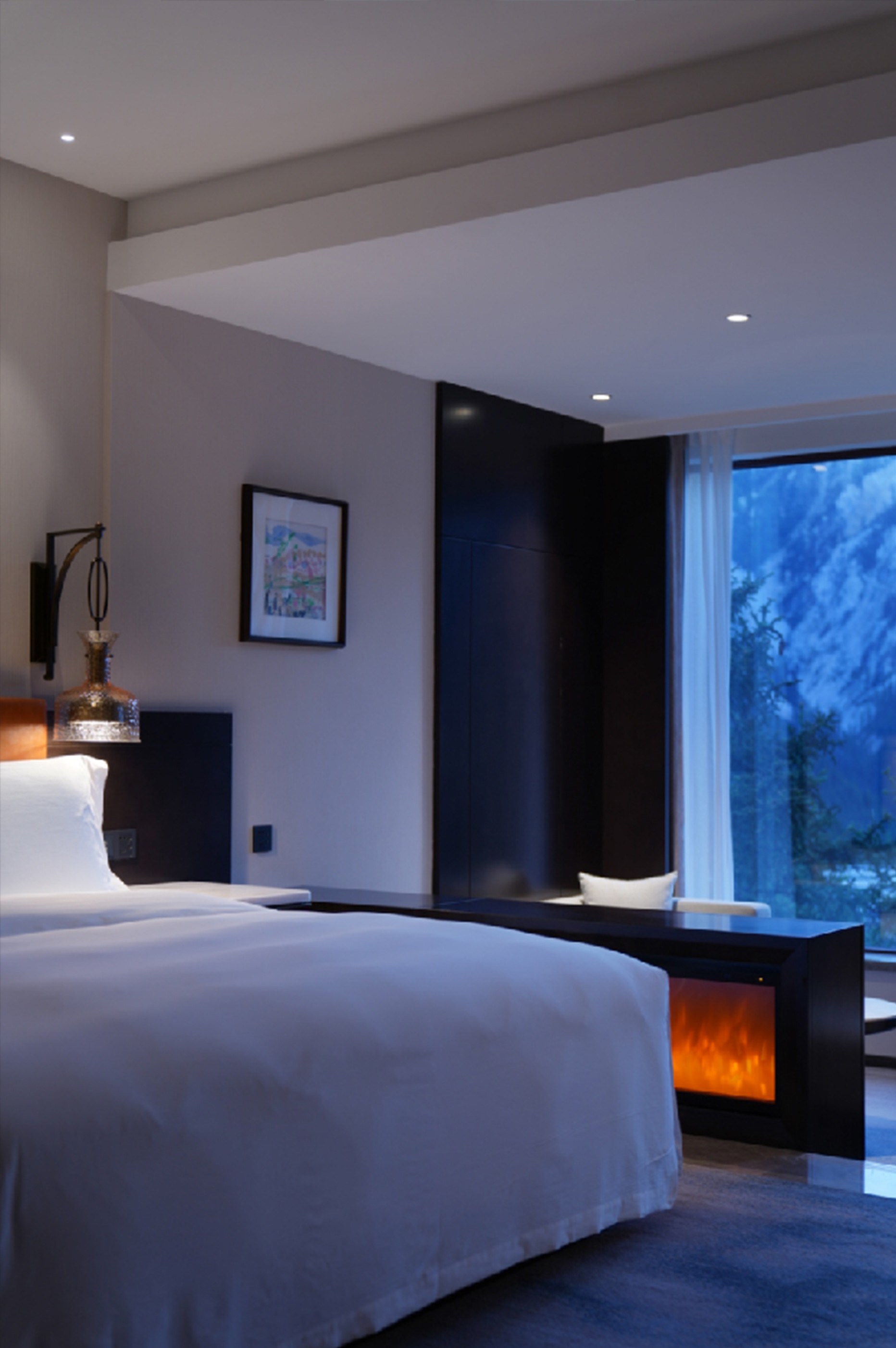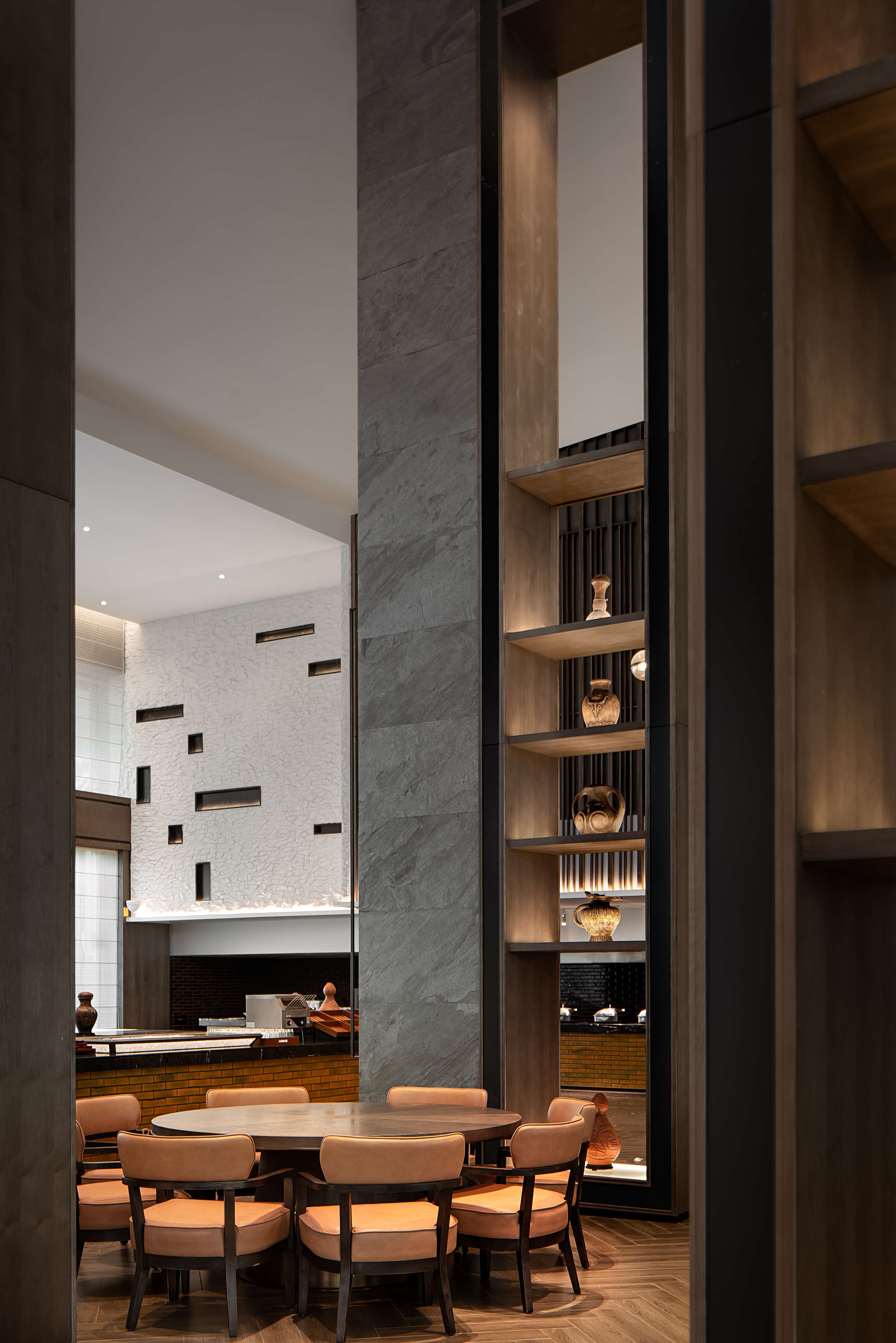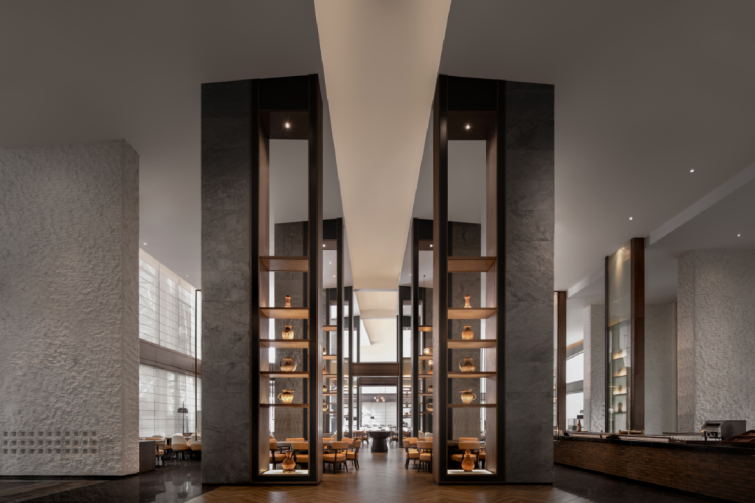 大堂休息區布置在景色最好的區域,這里被自然森林所環抱,不同的時節可感受不同的風景。