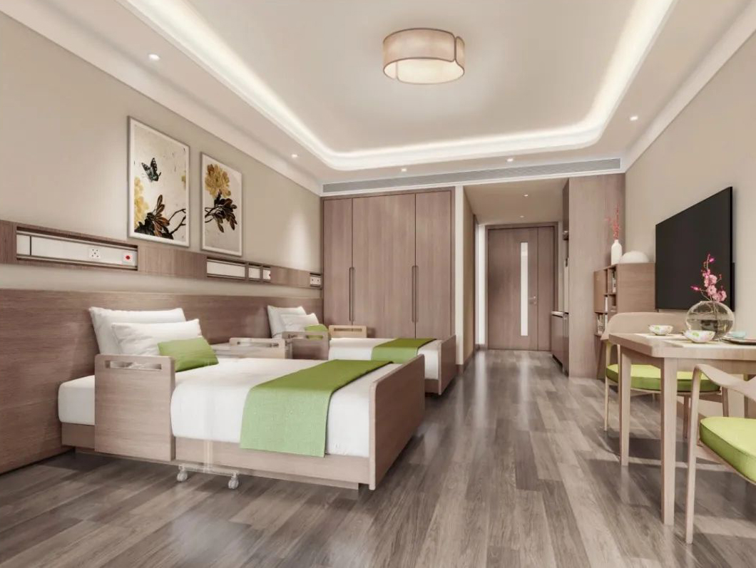 我們將山水元素作為整個空間的鋪墊,并以椿樹和木槿花作為核心元素,貫穿整個空間設計中。其中椿樹主要寓意健康長壽,木槿花主要指絢麗綻放,溫柔的堅持,它代表著紅火,象征著念舊、重情義,整體表達老人的身體層面和精神層面。