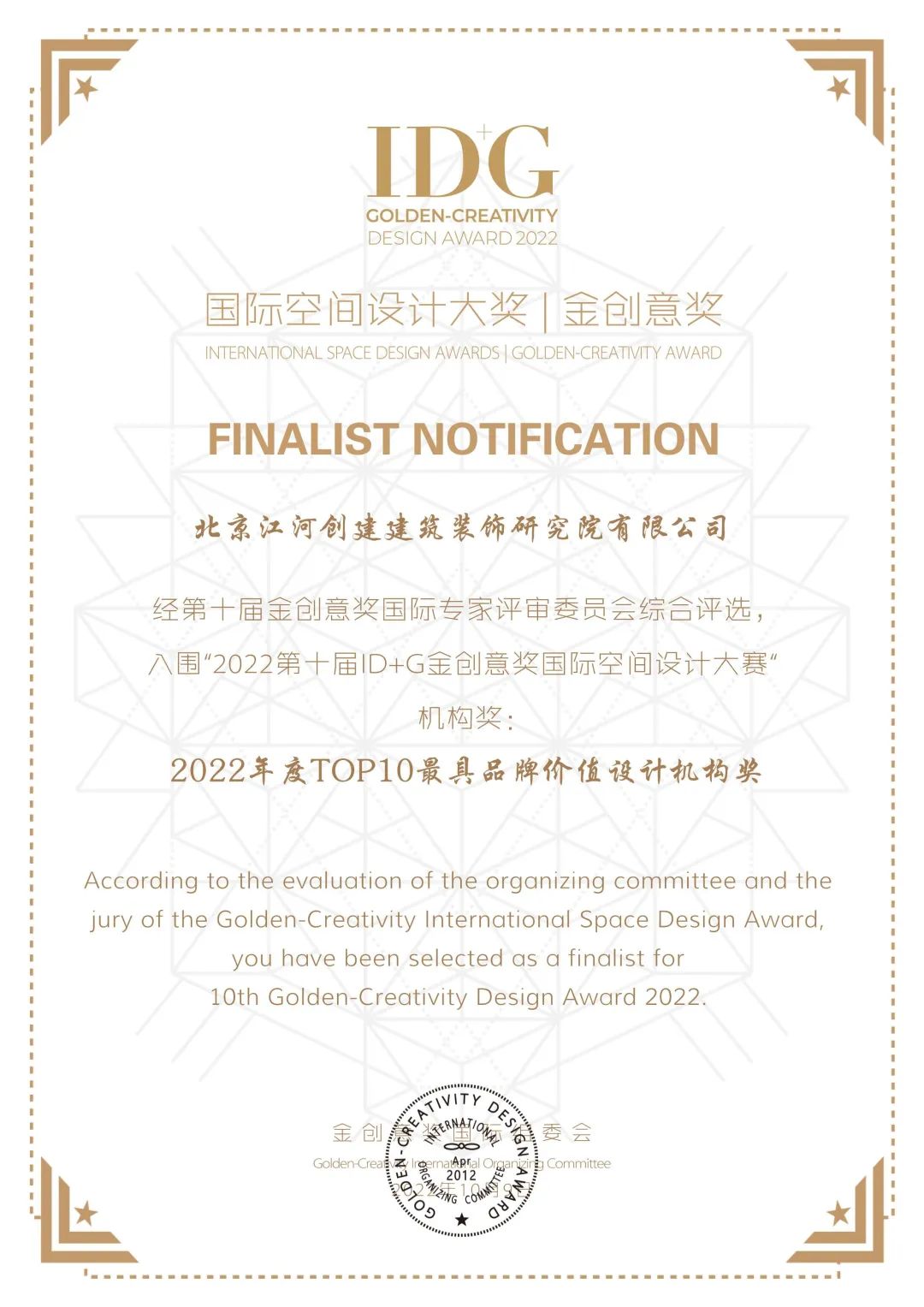 本次江河設計(JHD)以卓越的創造力,出色的設計力榮登榜單,斬獲2022年度TOP10最具品牌價值設計機構獎。