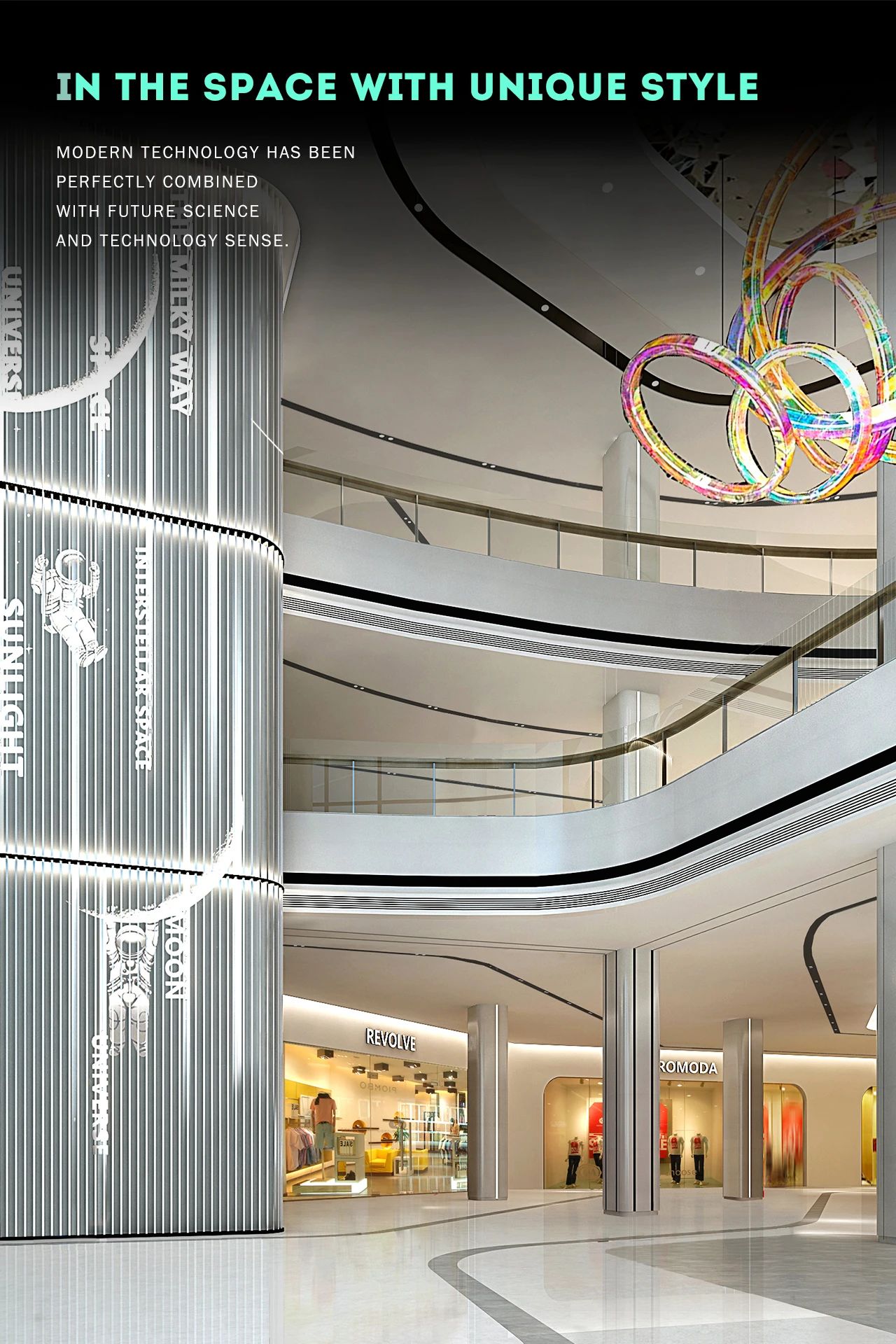 首層運用星球地表作為東入口的設計元素,三層天花中心一個富有科技感的金三角異形造型來突顯主題,配合宇宙星環燈光來整體打造空間,中心點的商業美陳裝飾來豐富空間氛圍。