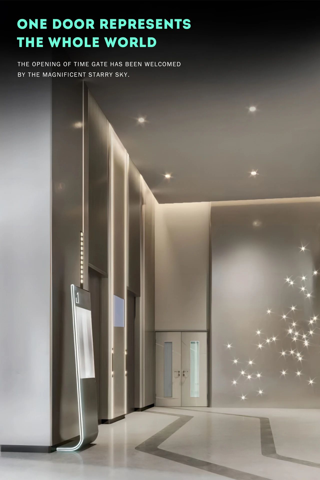 每層標識位置加入LED星光燈,韻律般的閃爍如同宇宙繁星,出每一層電梯都感覺到達了不同的星系。穿越星云到達前沿外星城市,體驗外太空游樂購物之旅。