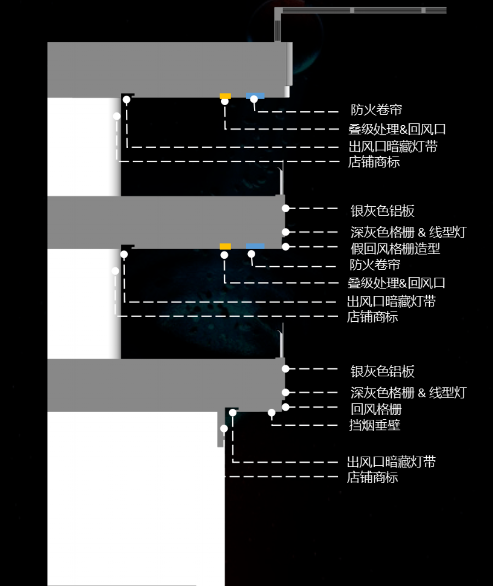 通過金屬材質的反射質感和LED線性燈條打造成富含感科技入口,從這里進入商場有一種登入未來太空飛船的體驗感。