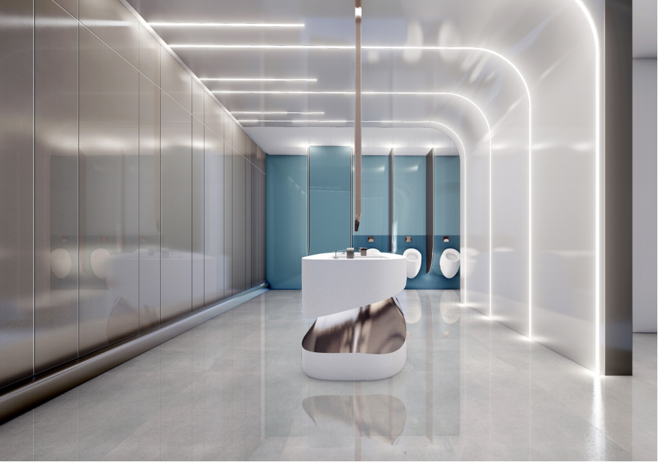 二層風洞體驗區,結合風洞設備本身的支撐柱,把風洞做整體打造,柱子采用金屬質感和線性燈條的設計,加上本身風洞的獨特體型,把風洞區域完美融入到周圍的環境,成為這個區域最為炫酷的打卡點,這同時也是未來科技城里最為閃亮的奇觀。