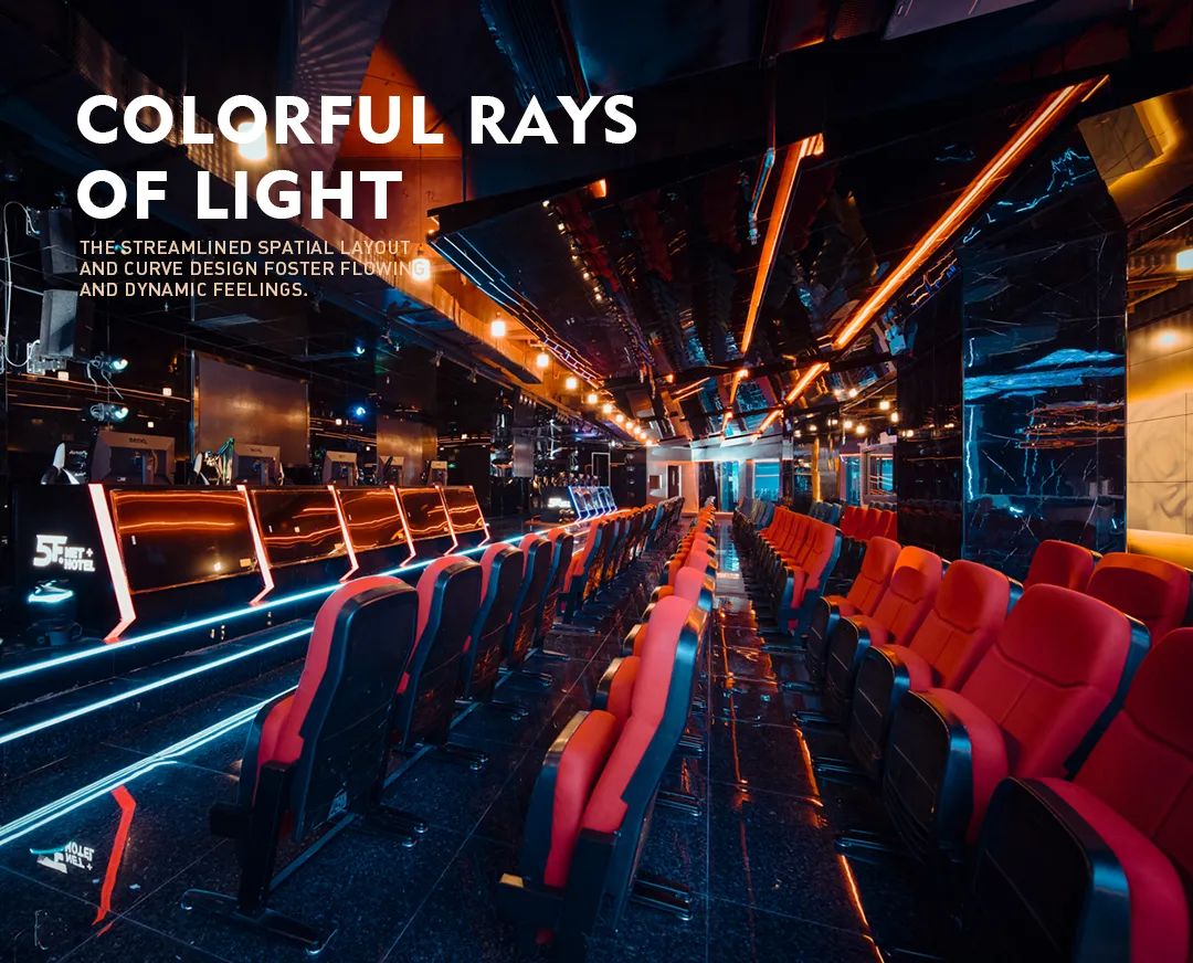 Designed with a cool, swift and fierce style, the space seems like a special field, which is full of abstract realities and true unreality. Lights and shadows are grinded and scatter in the whole space, fostering the distorted effect with flowing energy. Such kind of design technique makes the space both flexible and dynamic, bringing a kind of unprecedented experience for e-sport hotel.