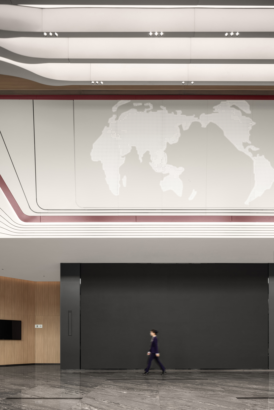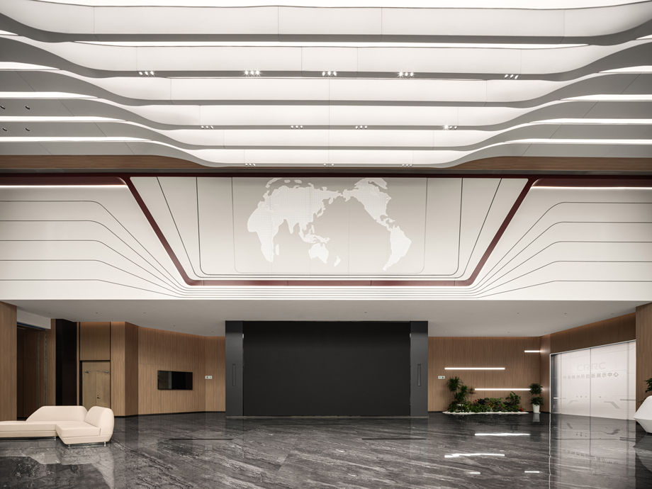 In terms of design techniques, the lobby incorporates world map elements to showcase an open and inclusive global perspective; At the same time, the embellishment of CRRC corporate elements highlights the cultural heritage of the space. The penetration of orbital elements, in its smooth and modern form, further enhances the transparency and modernity of the space, making the entire lobby visually more open and layered, showcasing a unique and harmonious aesthetic charm.