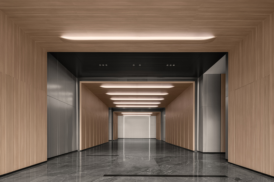 The design of the elevator hall incorporates the concept of track elements and axis symmetry, continuing the coherence and depth of the design. The ceiling design is centered around grandeur and simplicity, with a strong overall sense, reducing unnecessary decorative elements, emphasizing the purity and order of the space, and creating a visual effect that is both open and exquisite.