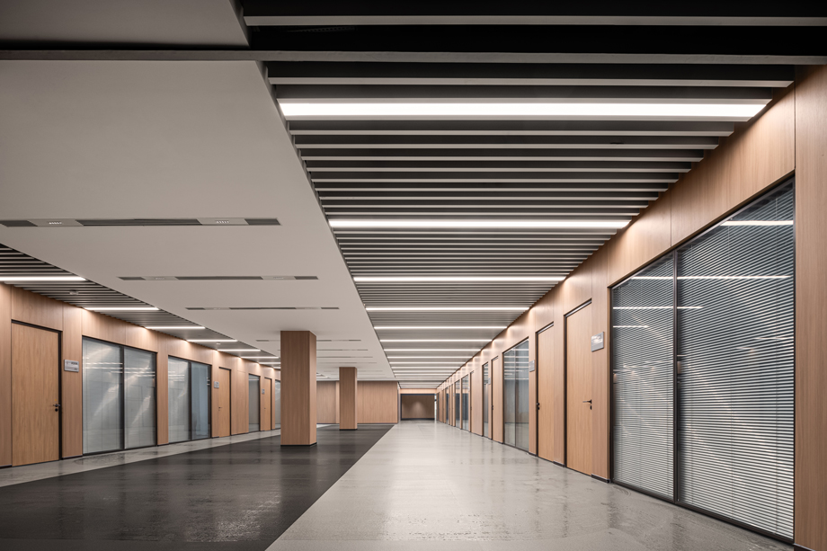 The corridor is made modern, grand and warm through design, which integrates CRRC elements into the ceiling. Through integrated design of wall surface and ceiling as well as orderly arrangement of various elements, the original long and monotonous corridor is upgraded into a space with obvious layer of layering and full of ceremonial atmosphere.