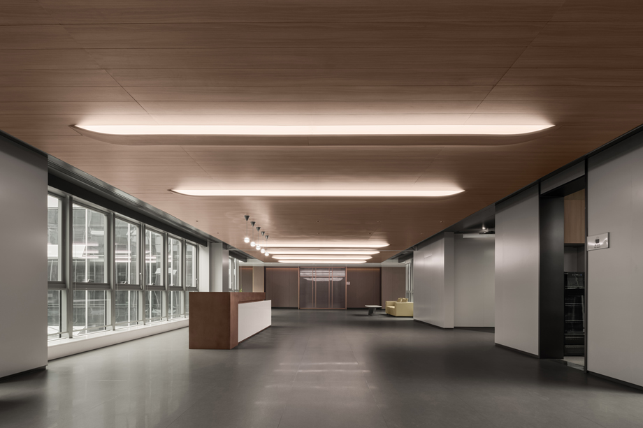 The holistic strategy of lobby spatial design is understood from three dimensions: linear mass; multi-layered streamline; spatial order. Firstly, the functional relationship is clear in the interactions and streamlines among advisory area, resting area, and coffee area.The global spatial framework is formed by a streamlined ceiling. The combination of metal gratings with magnetic tracks is meant to reflect CRRC’s corporate vision centered on rail transit equipment and simultaneously to give the space a clearer and more recognizable feeling of rhythms.
