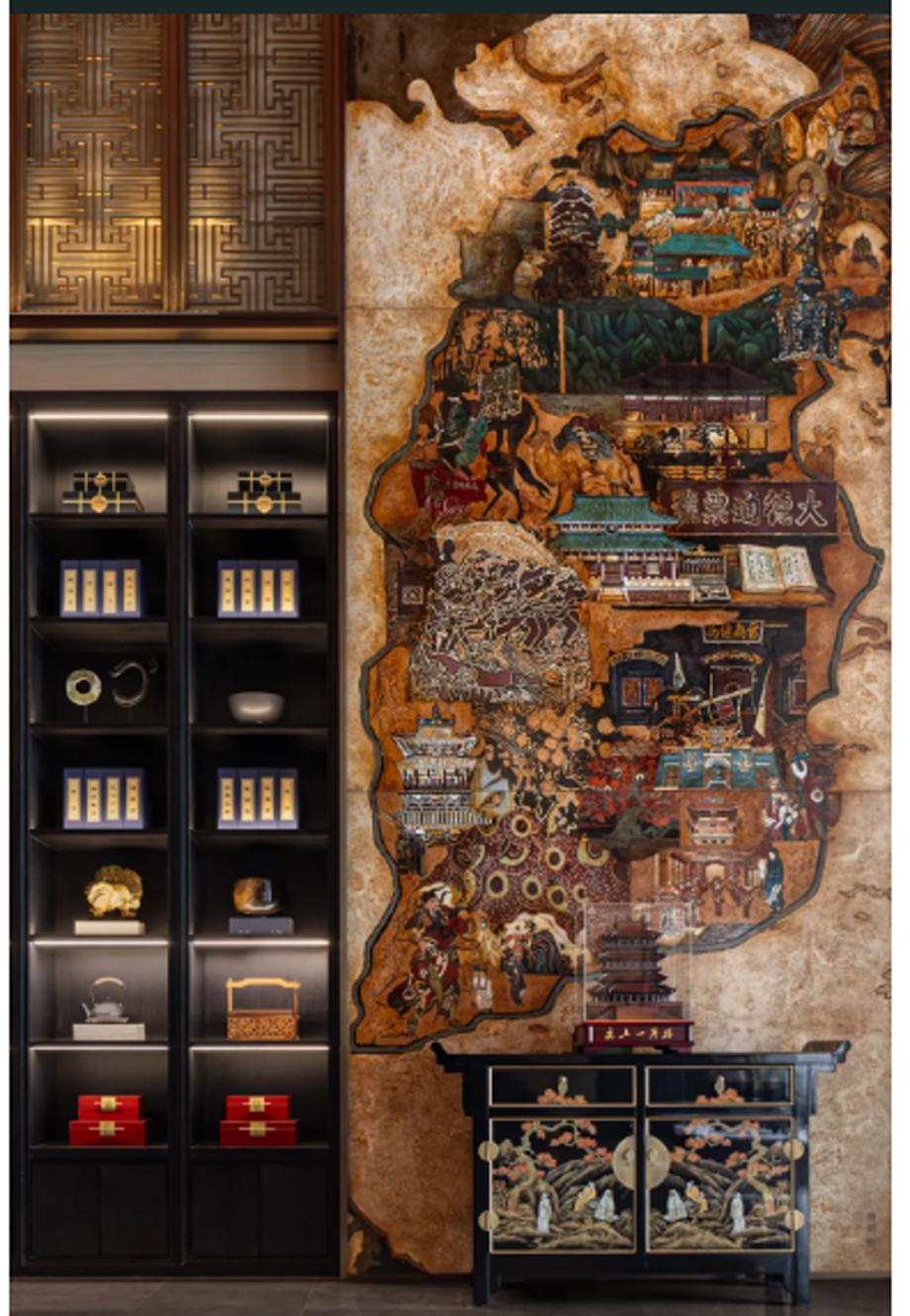 Based on the outline of Shanxi Province on the map, the "Splendid Shanxi Scenery" lacquer painting has integrated the Yungang Grottoes, Liuli Pagoda, and Guangsheng Temple in northern Shanxi, the Jin Temple, Pingyao Ancient City, and exchange shops in central Shanxi, as well as the revolutionary culture of Shangdang, and Yuncheng, the “Hometown of Guan Gong”, in southern Shanxi. It also connotes the stories and legends from the Taihang Mountains.
