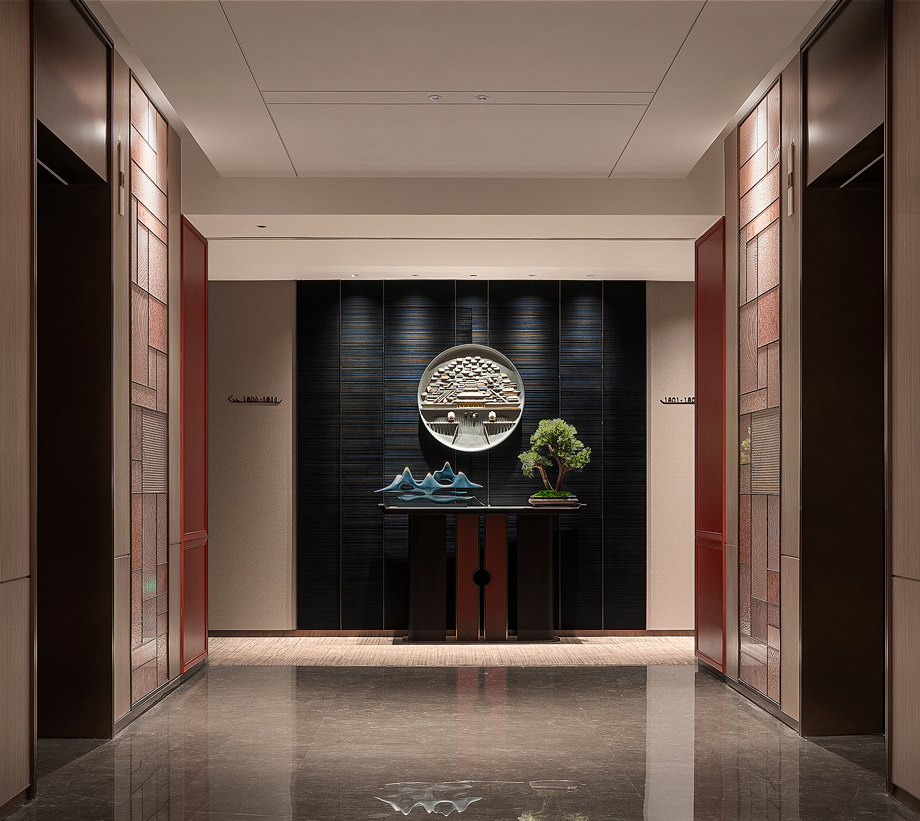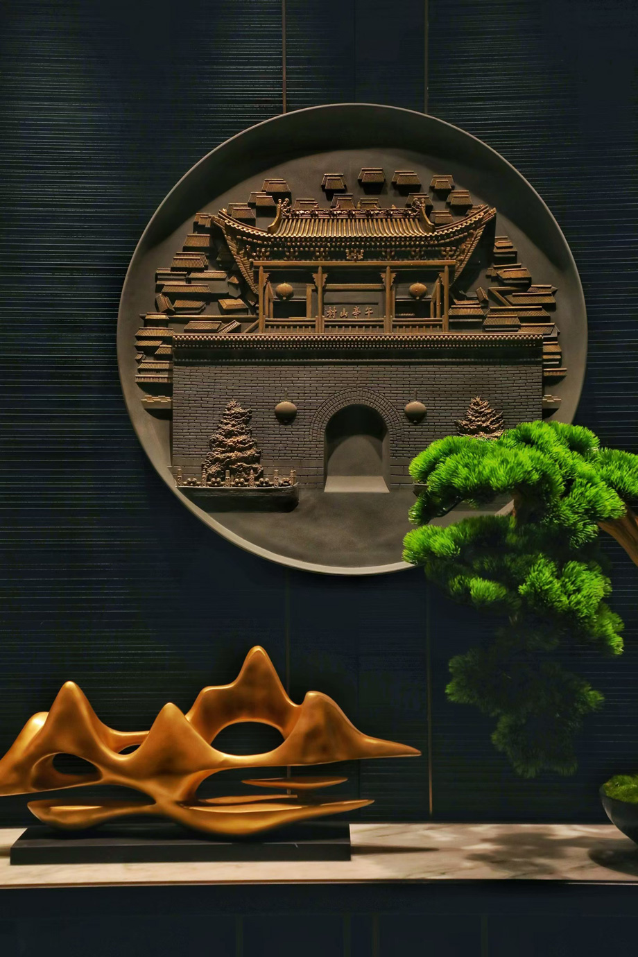 以建筑、木格漆器為元素,將山西著名的會館建筑擺件融入到建筑空間,致敬會館文化。