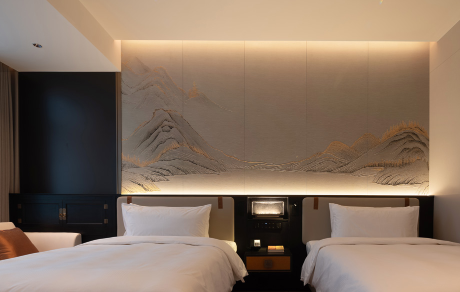 客房床頭背景以太行山景圖為主題,古典的裝飾風格融合山水意境,太行山下,山水之間,靜謐安眠,福種瑯嬛,每一處細節都蘊含著中庸的智慧,展現出中正、高尚的素雅格調。
