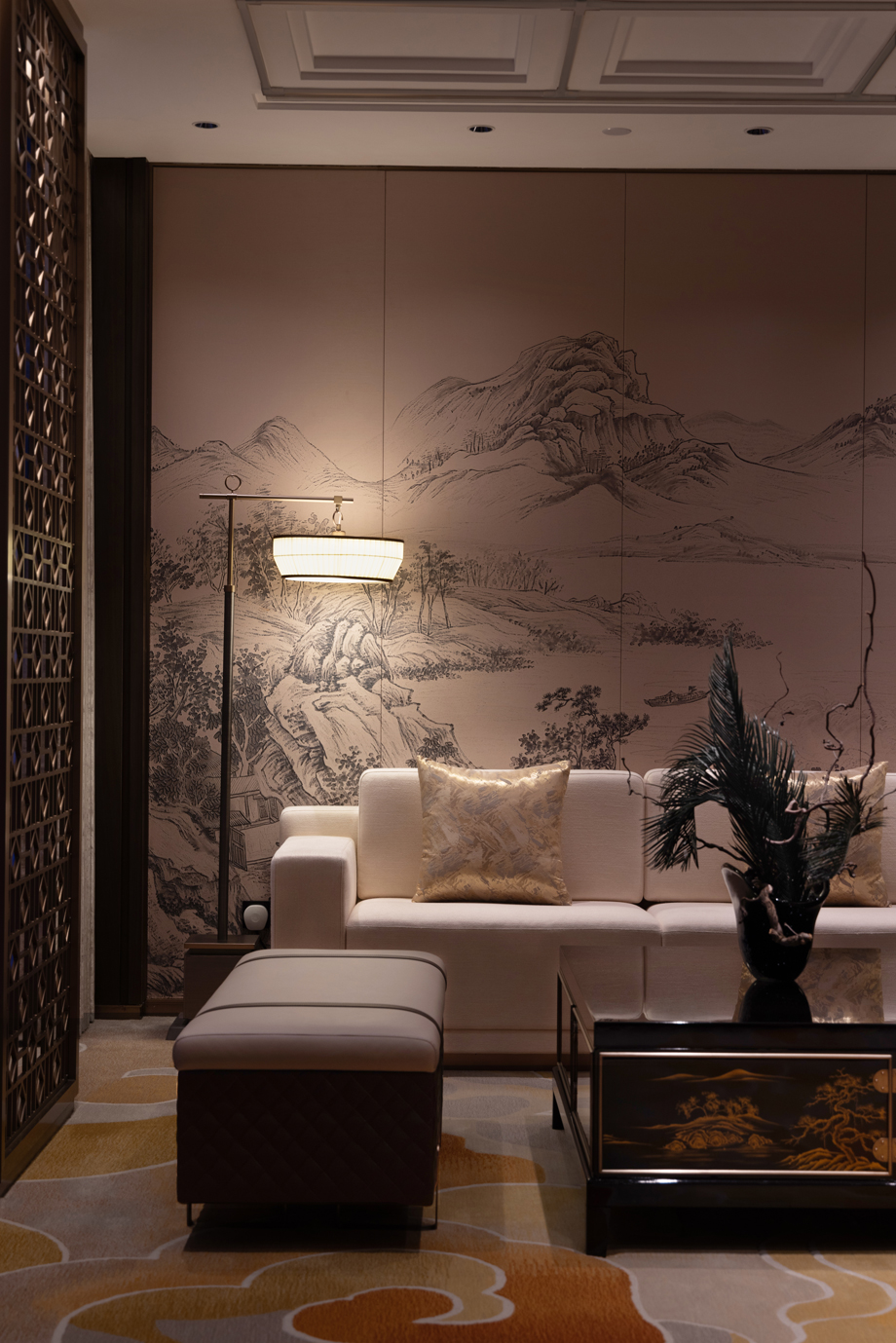 The background of the bed head in the guest rooms are decorated with a painting ofthe Taihang Mountain scenery. The classical decorative style is integrated with theartistic conception of mountains and waters. A peaceful and tranquil site is designed at the foot of the Taihang Mountains, and amidst the mountains and waters, each design detail embodies the wisdom of Doctrine of the Mean as well as the upright and noble style.