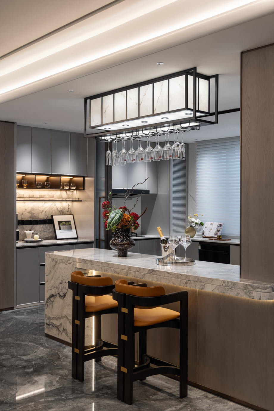 靜雅棕巖板地面如大地脈絡(luò),木飾面墻面與寶格麗紫巖板島臺(tái)碰撞出戲劇張力。