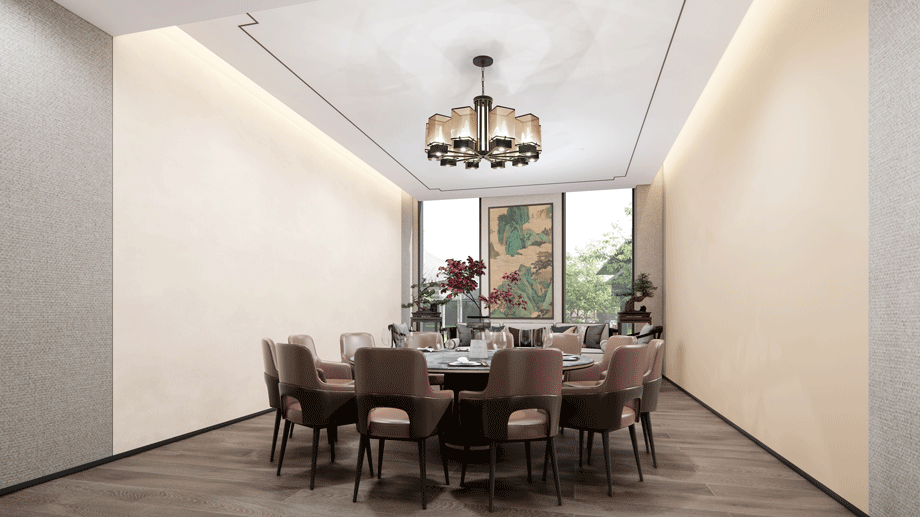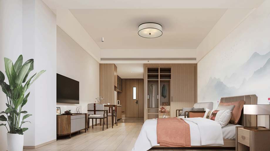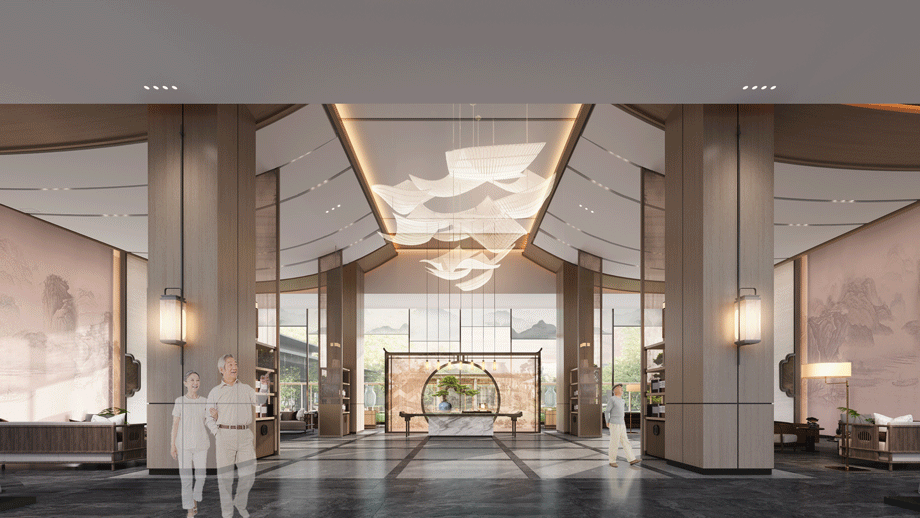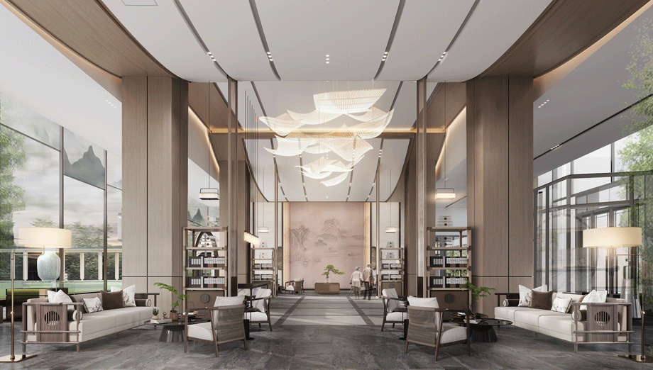 入戶大堂是整體空間的引領者,新中式設計風格,吊頂造型詮釋了主體元素“濟南之山”的形式。打破常規大堂設計手法,本案營造了酒店會所的氛圍,典雅而高貴,獨特的養老大廳,園中園設計的融入,進一步刻畫了中式風格。
