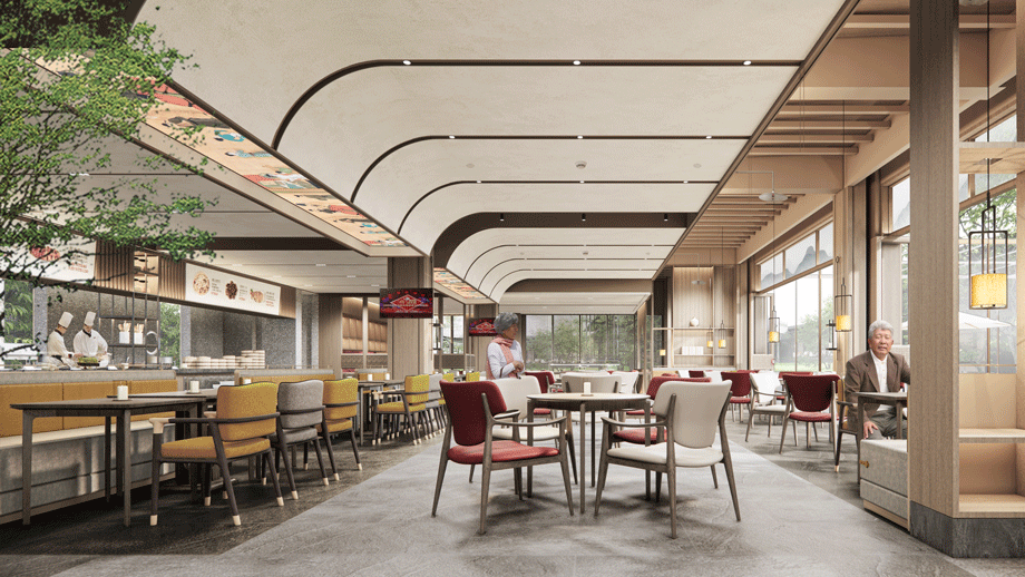 設計原則:空間劃分形式多變,考慮不同老年人心理狀態與用餐氛圍傾向性,可設置開放、半開放、私密不同屬性用餐環境,滿足其差異化需求。餐桌椅家具布局靈活,可以自由組合移動。使其在用餐后轉變為活動空間,變更空間使用屬性,促進空間使用的延續性。