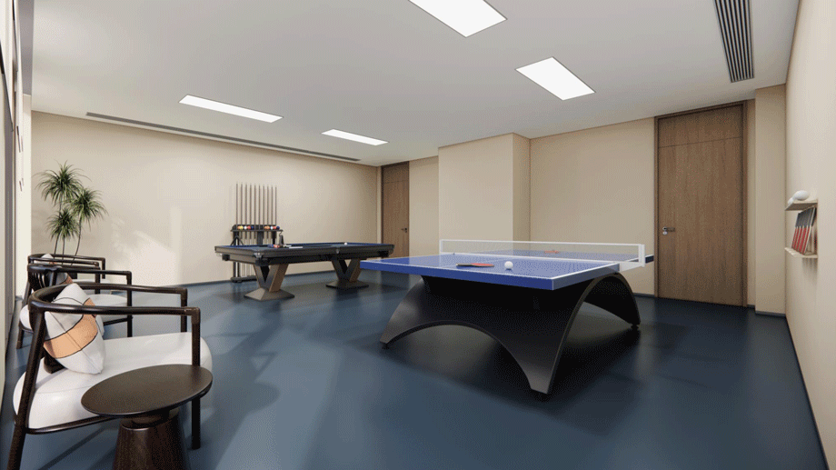 電梯廳一般位置流線便捷,人口密度相對較大區域,因此在電梯廳側邊設置休息座椅。設計結合轉角的開放活動空間,創造半私密空間,通過點和線的結合形式,使其形成小組團的交流社交。