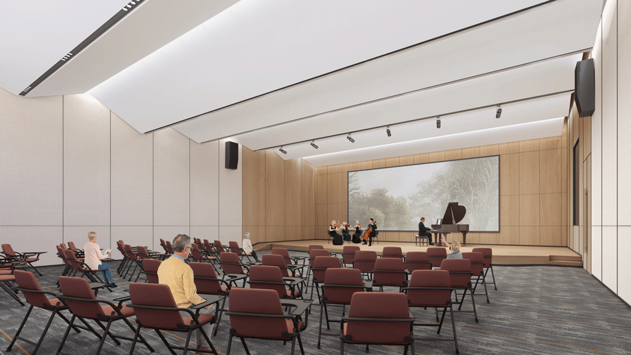多功能廳延續了“山”的設計元素,“山”型的吊頂設計,最大化利用結構關系,多種氛圍的燈光設計,滿足不同場景的使用。打造通高空間,光線引入中庭,營造老年人參與的活力度, 滿足老年人心理和感官的需求。