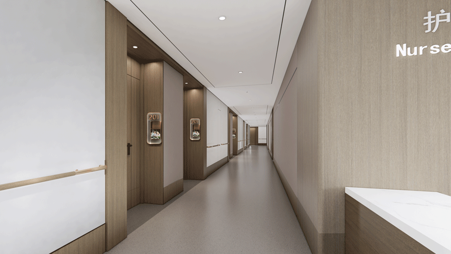 此區域緊鄰醫療部分,一方面作為護理區的等候區域、另一方面也作為護士站的監護視野區。這是第一個視線通道,來自醫護與居室外部公共活動區域的聯系。