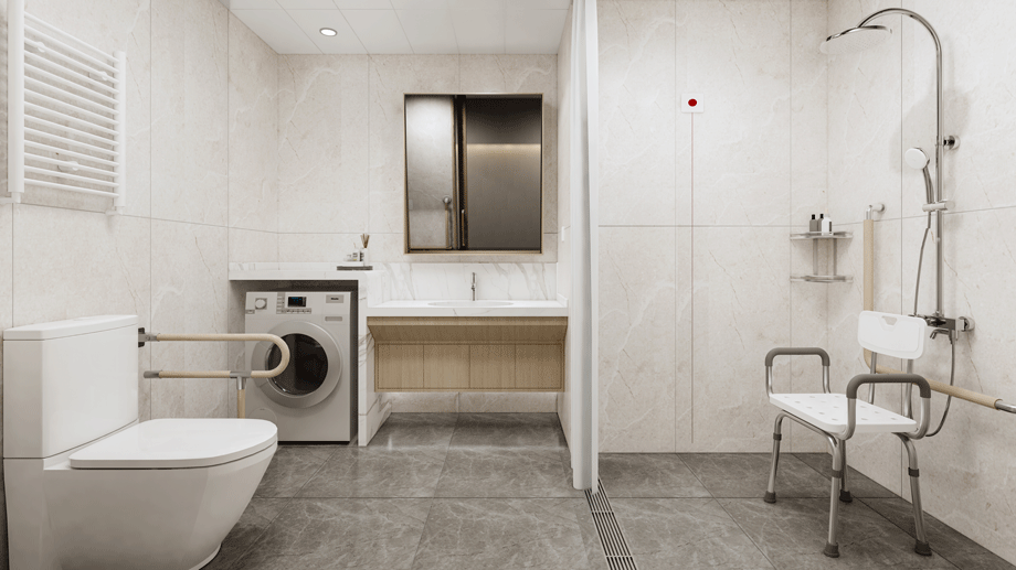 衛生間設計中,馬桶兩側皆設置支撐扶手,方便借力;同時在其中留出足夠的空間,滿足無障礙旋轉半徑;為了避免狹小的空間使人感到壓抑,衛生間墻面貼淺色系墻面磚,給人在心靈上帶來一種放松的感受,在視覺上給人一種空間被放大、通透的感覺。