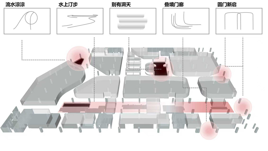 在室內空間的打造中,從天花、中庭、中島、門廊、門頭等不同區域入手,精心營造了“流水淙淙”、“水上汀步”、“別有洞天”、“疊境門廊”、“圓門新啟” 五大主題場景。