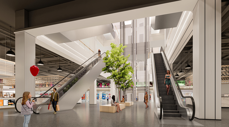 新舊交接區作為改造項目的關鍵部分,采用霧面灰香檳色金屬波浪板、不銹鋼等現代材質,結合燈光設計,實現新舊空間的自然過渡與和諧統一。該區域的設計既保留了原有建筑的韻味,又注入了現代商業的時尚元素。
