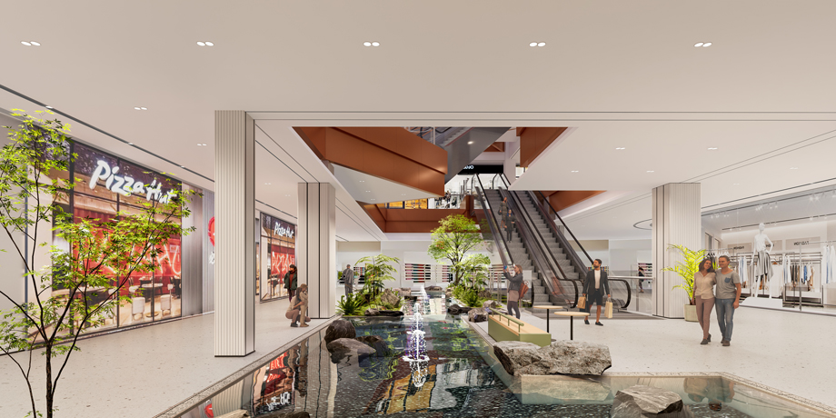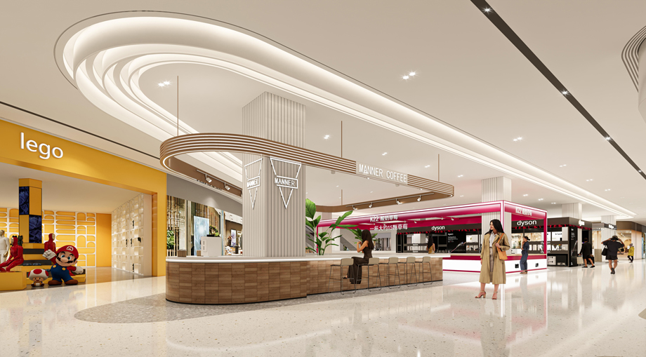 在中庭空間的改造設計中,天花采用流線型設計,模擬山丘的等高線形態,賦予空間以動感和層次感。這種設計不僅美化了視覺效果,還引導顧客的行走方向,增強空間的導向性。