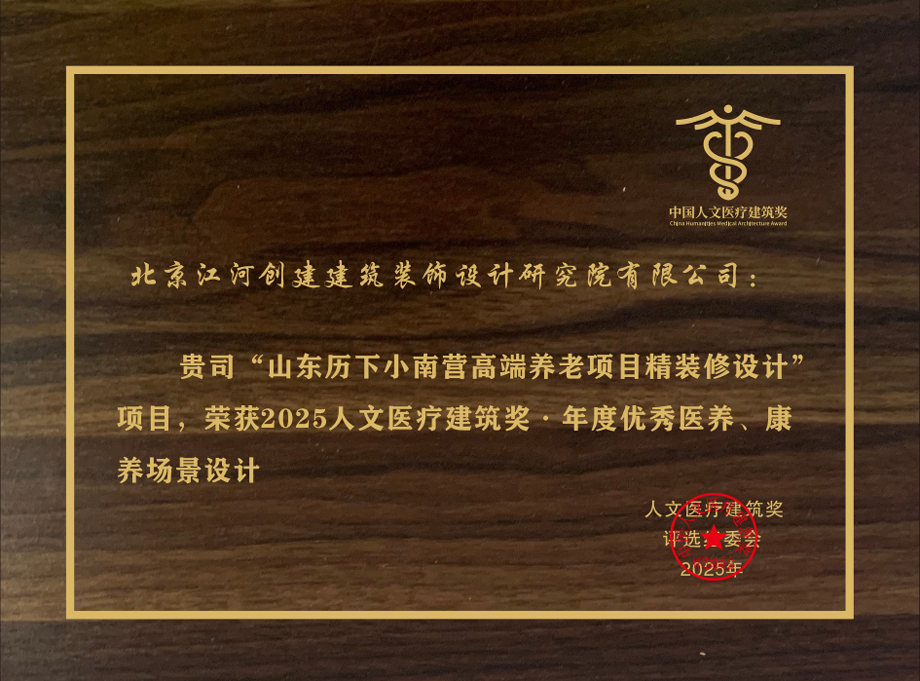 江河設(shè)計(jì)JHD作品濟(jì)南麗山國(guó)際·槿椿濼園榮獲年度優(yōu)秀醫(yī)養(yǎng)、康養(yǎng)場(chǎng)景設(shè)計(jì)獎(jiǎng)。